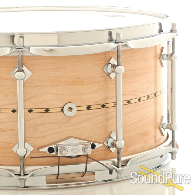 The Custom Shop Snare Drums are the flagship drums of the Craviotto Drum Company, and consist of high performance, highly collectible Solid Shell snare drums. Available in Ash, Maple, Cherry, Poplar, Walnut or Mahogany (or any Stacked Solid combination thereof), with an optional Maple, Cherry or Walnut inlay, each Custom Shop Snare Drum features a hand-selected, handcrafted shell and gleaming chrome-plated hardware along with premium-quality components including Craviotto’s chrome over brass machined “Diamond” tube lugs, Aquarian drumheads and Craviotto Deluxe Snare Wires. All drums come with a chrome Trick GS007 strainer. Options include a choice of heavy-gauge (2.3mm) triple-flanged Vintage style straight or diecast counterhoops and natural satin oil or high-gloss lacquer finish.