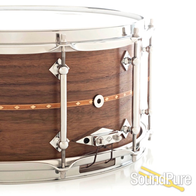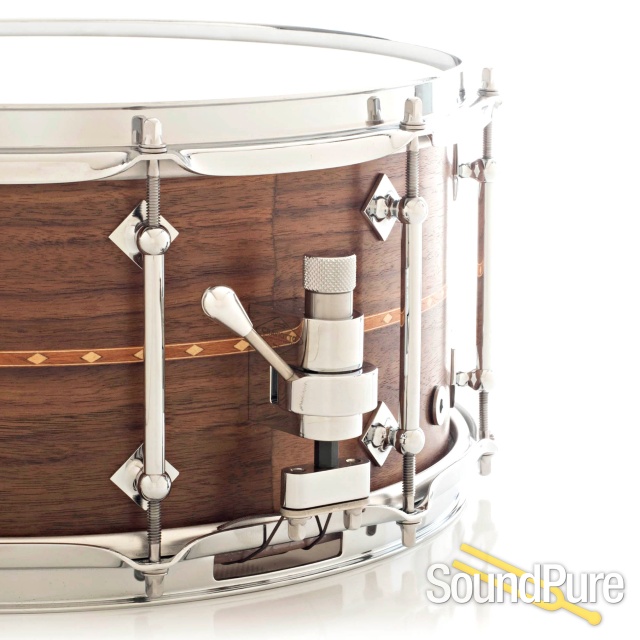 This Craviotto custom snare drum is simple and elegant with a satin finish allowing the natural flowing grains of the walnut body to show through. The classic tube lugs tune easily and hold tune easily as well. It also is equipped with the Trick throw-off, which has really become the industry standard for custom companies. The baseball bat bearing edges offer a smoother sound than it's contemporary cousins with 45-degree bearing edges.