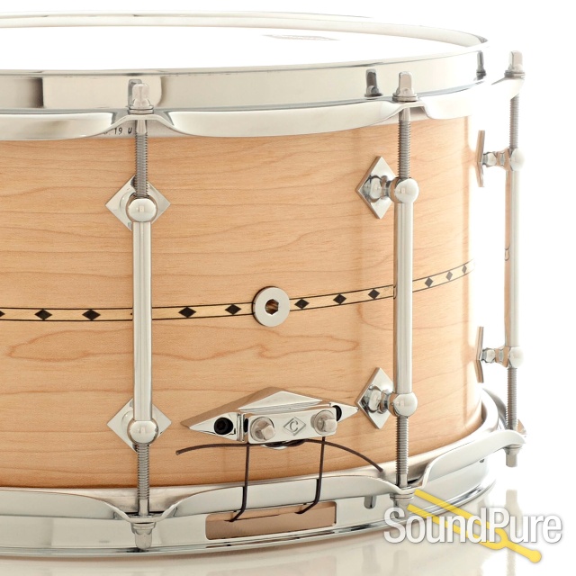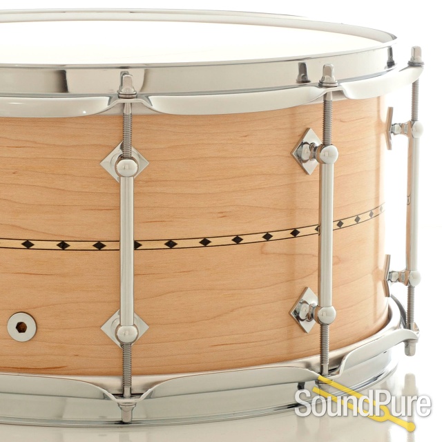 This Craviotto Custom Maple snare drum delivers excellent attack and quick decay in an un-assuming package. Outfitted with 45-degree bearing edges, this snare has great definition in multiple tuning ranges. The finish is simple and elegant, allowing the inlay and natural grain of the maple shell with matching reinforcing rings to reveal themselves. The classic tube lugs tune easily and hold tune easily as well. It also is equipped with the Trick throw-off, which has really become the industry standard for custom companies. Since their inception, Craviotto drums have been considered some of the most sought-after instruments in the world. It is their craftsmanship and commitment to quality that has set their work apart from all of the rest. Once you hit one of these incredible drums, you'll see why it's no wonder so many players go to Craviotto to find their sound.