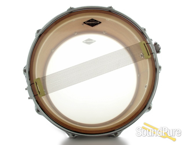 Mahogany snare drums have a distinctively dark, earthy tonal quality derived from the more porous, less dense wood that naturally filters the snare's high frequencies. The reinforcing rings are used as a way to help counterbalance the Mahogany's prominent lower overtones by stabilizing the shell, raising the pitch and increasing its projection without sacrificing its unique tonal tendencies. Since their inception in 1990, Craviotto drums have been considered some of the most sought after instruments in the world. It is John Craviotto's master craftsmanship, and commitment to quality that has set his work apart from all of the rest. Once you hit one of these incredible drums, you'll see why it's no wonder so many players go to Craviotto to find their sound.