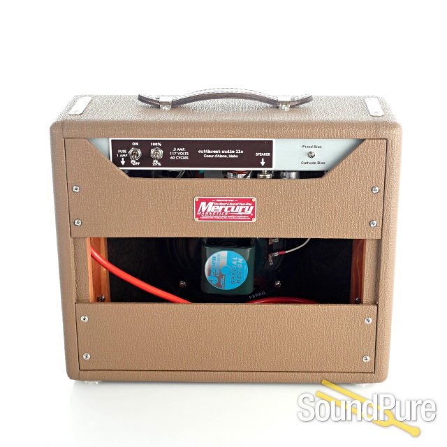 The Little Wing™ 6G1 has two channels. Yes, I know Champs only had one channel, but work with me here. Input 1 is the Brown channel with a decidedly Brownface voiced preamp. Input 2 is the British channel with a JMP50 voiced preamp. One volume and tone control serves both channels. Pulling the volume knob internally jumpers the British + Brown channels for a very cool third voicing. Since the chassis used can accommodate (2) preamp tubes, it was a no-brainier to use half of a second 12AX7 for a second channel. Pulling the tone knob adds additional second stage preamp gain; great for gain at lower volumes. The NFB knob allows for fully adjustable negative feedback, ranging from heavy to light NFB. An Off/Standby/On power switch is located on the rear panel. Next to it is a 100% or 25% switch which lets you drop the power output to the speaker to just over 1 watt for reduced volume with no loss of tone. You can also switch between Cathode Bias and Fixed Bias.
