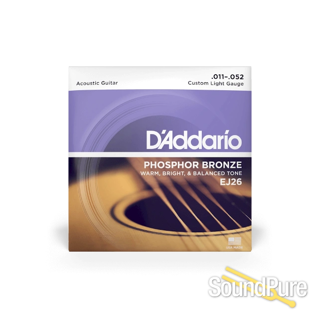 Referred to as Custom Light, EJ26 strings are a D'Addario original hybrid gauge and a comfortable compromise for players who want the depth and projection of light gauge bottom strings, but slightly less tension on the high strings for easy bending.
