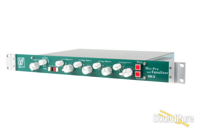 The Mic Pre EQ MKll is a single channel high end, all discrete Class A transformer balanced (input and output) unit that combines a great mic pre and world class EQ in one single rack unit. Separate mic and line inputs can be selected from the front panel “line” switch without changing wires in back. Both inputs are combo XLR/ 1/4 in TRS. High gain of 70dB handles all types of mics from ribbons to dynamics and condensers. Switched phantom enables secure ribbon mic use and 20dB pad switch prevents overload on high output condensers mics. Front panel Phase switch for inverting input phase and large overall mute button and bypass button help the work flow.