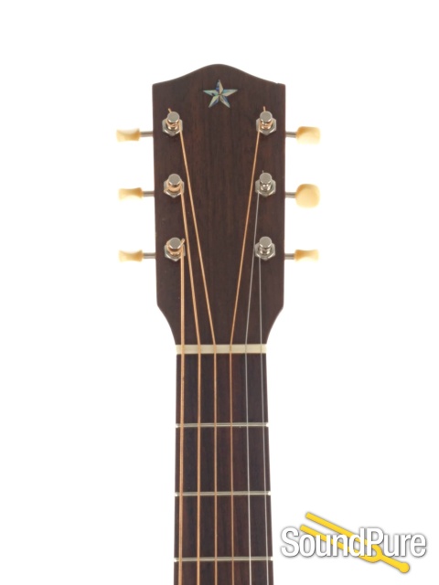 While it may only be our 2nd guitar from the masterful David Newton by way of a previous owner, if you're looking for a killer, smallbody Blues machine, this will be the final stop on your journey. Impossibly light, impossibly loud, impossibly crisp and clear from bass to treble--this is the kind of guitar that will ruin, RUIN you when it comes to what you expect from a 00 size (or a Maple b/s instrument of any size, for that matter). And let's not skimp on the other stuff--that flat, 1 3/4" neck and nut are roomy enough for ragtime but fast enough for fleet-fingered forays up and down the neck. And what a sight to behold from a purely cosmetic perspective: the star inlay on the peghead, the tortoise bridge pins, the french polish finish; heck, even the label in this thing looks good!