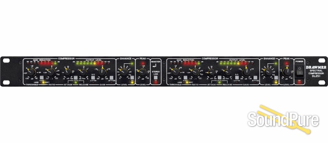 It is well known that compression, in its basic form, tends to remove high frequencies from any material with a wide bandwidth. This is because material usually has less energy at high frequencies than it does at low frequencies and since single band compressors are not frequency conscious, the 'highs' are attenuated together with the 'lows'. Using a slow attack time improves matters to some extent, but signals containing many harmonics (eg: vocals, strings and brass) or dynamic signals with a powerful 'leading edge' (eg: piano, kick and snare drum) tend to lose some clarity which often requires further audio processing. It is a fact that many engineers who would like to use a compressor in a particular application, avoid doing so because they feel that the 'sound loses something'. The DL251 'Spectral Compressor', incorporates a variable 'Dynamic Spectral Enhancement' (D.S.E.) section which eliminates the problems associated with full band compressors by restoring the high frequency energy lost during the full band compression process. This enhancement circuitry is extremely effective where compression and limiting are employed for broadcast transmission, or across complete mixes in a stereo mixdown situation. 'Dynamic Spectral Enhancement' has many creative applications when recording individual components at the multi-track stage, particularly on such programme as acoustic guitar, piano, brass and vocals. Facilities available on the DL251 include: Compressor. The compressor section can be switched to provide either HARD or SOFT knee compression In both the HARD and SOFT modes a Ratio control is available In the S0FT mode the ratio increases gradually over a 10dB input level range until it reaches the ratio set on the front panel control, thus achieving a more natural sounding compression. Selectable manual or automatic Attack and Release times dramatically extend the application range and user scope of the DL251. Selecting the 'Auto' mode removes the need for manual adjustment and is particularly valuable when the programme being treated does not have predictable or consistent dynamics, such as on complete mixes, vocals or 'slapped and pulled' bass guitar. Under manual control the wide range of adjustment available gives the user the ability to create dynamic effects as well as normal compression. Enhance Level. A variable Enhance control can be used to 'dynamically' boost any high frequency energy lost during the full band compression process and has sufficient range to add additional 'Spectral Energy' to the programme material for creative processing. When no compression is taking place, the 'Dynamic Spectral Enhancement' circuitry is inoperative and so no change is made to the signal. However, as the signal level rises to the point where gain reduction is taking place, the Enhancement system 'kicks in' applying dynamic boost which is directly related to the amount of gain reduction taking place. A front panel switch offers an instant A/B comparison of this feature and a green LED indicates the amount of enhancement taking place. Metering. Comprehensive bar graph displays give 'at a glance' indications of gain reduction, and input/output signal level Gain reduction from 1 dB to -30dB is shown simultaneously with signal level from 20dB to + 15dB Other single LEDs indicate function status of Hard/ Soft compression, Auto Attack/ Release, Side chain monitoring, Bypass, Enhancement, Peak Limiting, Stereo Linking and Power on. Side Chain Listen. A front panel push button with LED status enables the monitoring of any external processing applied to the side chain access connections on the rear panel. Bypass. A fully balanced hard wire bypass connects the input directly to the output allowing signal to pass through the unit with no power applied. In bypass mode the output level bar graph displays the Input signal. Stereo Link. When processing stereo signals, linking should be used to prevent image shifting. This facility ties both channels together. Using channel 1 (Left) as the master channel removes the need to duplicate control settings for both channels. A rear panel switch allows the selection of 'Peak' or 'Average' stereo signal detection. Peak Level. 'Zero Response Time', 'Zero Overshoot' circuitry provides an absolute limit to the peak level of the output signal, adjustable from 0dB to +16dB above system level When set to the required level, any excessive peaks will be stopped and the gain momentarily decreased if necessary The 'Zero Response Time' is essential to avoid unpleasant distortion when mastering for CD or sending any signal to digital equipment. 'Zero Response Time' means that the DL251 provides complete protection from even the fastest and shortest signal 'spikes' (overloads), making the unit also ideally suited for speaker system protection in sound reinforcement applications. Operating Level. The operating level of the DL251 can be instantly switched, independently on each channel, for either +4dBu or -10dBu operation using a rear panel push switch. Input/Output. The DL251 is provided with balanced inputs and outputs on XLR connections.