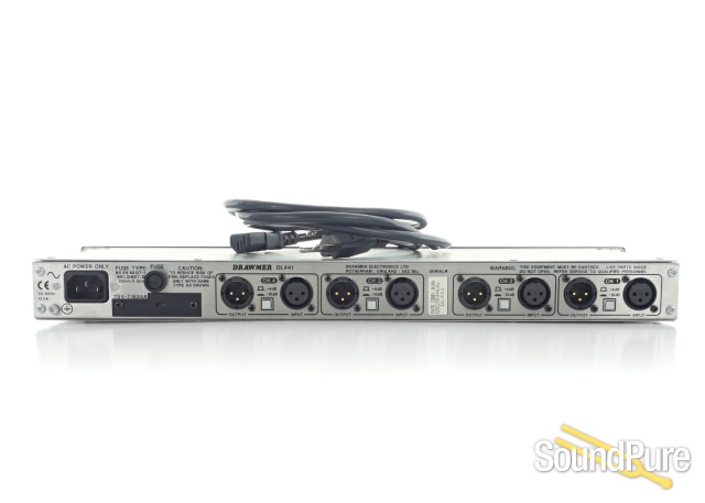 The DL441 Quad Auto Compressor/Limiter captures four channels of Drawmer's innovative DL241 'Auto Compressor' in only 1U of rack space. The inclusion of new sophisticated 'automated' circuitry allows the engineer to precisely control both the dynamic range and 'absolute' peak level of the programme instantly, without sacrificing essential control parameters. This perfect balance of features makes the DL441 ideal for use in sound reinforcement and outside broadcast applications where an economy in rack space is essential. Each channel combines a fully professional 'Auto Attack/Release' Compressor with a variable threshold 'Peak Level' Limiter on the output providing a transparent 'endstop'. High resolution bar-graph displays on each channel allow gain reduction and output level to be viewed simultaneously, of particular importance in darkened concert hall or control room situations. Facilities available on the DL441 include: Compressor - The compressor section can be switched to provide either HARD or SOFT knee compression In both the HARD and SOFT modes a Ratio control is available. In the SOFT mode the ratio increases gradually over a 10dB input level range until it reaches the ratio set on the front panel control, thus achieving a more natural sounding compression In HARD mode the compressor provides a more precise means of controlling gain, where the ratio as set on the front panel is applied immediately the signal exceeds threshold. This is particularly useful in many broadcast applications. HARD knee compression can also be used creatively as an effect, particularly in the treatment of drum and guitar sounds, or for giving rock vocals a 'compressed sound'. Auto Attack and Release - removes the need for manual adjustment by producing a response which constantly follows the dynamics of the signal. This enables the DL441 to preserve crisp transients without allowing excessive peaks to occur. A smooth yet lively recovery from compression minimizes side effects such as 'pumping' and 'breathing'. This feature is particularly valuable when the program being treated does not have predictable or consistent dynamics, such as complete mixes, vocals or 'slapped and pulled' bass guitar. Peak Level Limiter - 'Zero Response Time', 'Zero Overshoot' circuitry provides an absolute limit to the peak level of the output signal, adjustable from 0db to +16dB above system level. 'Zero Response Time' transparent limiting means that the DL441 provides complete protection from even the fastest and shortest signal overloads, making the unit ideally suited for speaker system protection in sound reinforcement applications. The sophisticated circuitry will also prevent unpleasant distortion when used for digital mastering. Metering - Comprehensive bar graph displays give 'at a glance' indications of gain reduction, and input/output signal level Gain reduction from 1dB to 30dB is shown simultaneously with signal level from 10dB to +10dB. When the channel is in BYPASS the output bar graph displays the input signal level. Other single LEDs indicate function status of Hard/Soft compression, Bypass, Peak Limiting, Linking, and Power on. Bypass - A fully balanced hard-wire bypass connects the input directly to the output allowing signal to pass through the unit with no power applied. Stereo Linking - Channels 1-2 and/or 3-4 can be stereo linked, where the left channel of the stereo pair becomes the master. Operating Level - The operating level of the DL441 can be instantly switched, independently on each channel, for either +4dBu or 10dBu operation using a rear panel push switch. Input/Output - The DL441 is provided with balanced inputs and outputs on XLR connections.