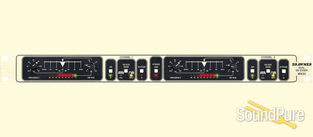 The human voice is one of the most diverse signals ever encountered by engineers because it contains such large variations in level and harmonic structure. Getting the desired vocal sound can sometimes prove difficult. Setting the E.Q. to give the vocal sufficient 'definition' and 'cut' in the mix can cause large sibilant peaks which often lead to severe distortion. The MX50 'Vocal' De-Esser solves these problems quickly and efficiently by reducing the level of the sibilant sounds whilst leaving the remainder of the signal unchanged. The MX50 is a flexible, simple to set up dual De-Esser designed to fulfil the needs of the Recording Studio, Broadcast, Theatre and Live Sound Industries. Its classic application is to overcome the problems that can arise when sibilant sounds (S's and T's) are over-emphasised by the human voice, with such other applications as 'smoothing' a stereo mix, reducing string noise on acoustic guitars or breath noise on flutes, even refining cymbal and hi-hat sounds. Processing is achieved by adjusting just two control parameters, Frequency and De-Ess. The fully variable Frequency control operates from 800Hz to 8KHz encompassing the full sibilant range, including 'hard' sounding harmonics and other side-effects which can be generated when treble frequencies are boosted or enhanced. This is followed by the variable De-Ess which acts as a 'more' control giving up to 20dB of gain reduction at the selected frequency. The MX50 has two modes of operation: Split Band de-essing Recommended for the majority of applications, this mode splits the audio spectrum into two bands with the split point being dictated by the position of the Frequency control. Only frequencies above the split point are attenuated. Full Band de-essing A useful alternative where unobtrusive minimal processing is required. This mode reduces the total signal level in response to sibilant peaks in the selected frequency band. Further features are also incorporated to improve ease of control and flexibility: Floating Threshold System: This intelligent Drawmer circuitry has a floating Threshold that adapts to the dynamics and level of the incoming material, eliminating the need for a manual Threshold control and creating more natural results. Air function: As sibilance rarely occurs above 10KHz this feature adds back high frequency 'gloss' in excess of 12KHz preserving upper harmonics and increasing the transparency of operation. Frequency: This control selects the frequency band in which the de-esser operates. In Split Band mode this control also determines the split point above which gain reduction will take place. The control is continuously variable from 800Hz to 8KHz and covers the full sibilant range. De-Ess: Adjusts the amount of gain reduction that will take place when a sibilant sound has been detected. Up to a maximum of 20dB may be applied. This control uses an intelligent Floating Threshold circuitry which removes the need for a manual De-Ess Threshold control. One of the benefits of this design approach is that during quiet passages the sibilants are held to a level which is relative to the original signal. Split Band De-Ess: Split Band operation will only reduce the selected frequencies above the value set via the Frequency control. In most situations this mode, in conjunction with the Air function, offers the most transparent de-essing. Status LED illuminates when engaged. Full Band De-Ess: Full Band operation will reduce the total signal level in response to signals in the selected frequency band. Status LED illuminates when engaged. Air: The Air control enables frequencies above the sibilant band to be retained, greatly increasing transparency of the de-essing process. During normal use it is recommended to keep the Air function active for both Split Band and Full Band de-essing. Status LED illuminates when engaged. Link: Depressing this switch configures the unit for stereo operation where the average left/right signal level is used as the Floating Threshold. In linked mode the red status LED beneath the link switch will illuminate. De-Ess Gain Reduction Display: A nine segment LED bargraph shows how much gain reduction is being applied up to a maximum of 20dB. In Full Band mode gain reduction is applied to the whole signal, whilst in Split Band mode only frequencies above the value set on the frequency control are subject to gain reduction Bypass: The Bypass position routes the input signal to the output with no processing. These switches are independant of any linking and will only bypass their respective channel. Status LED illuminates when engaged.