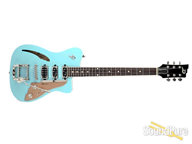 The body is then fitted with a flat maple top for the Narvik Blue and Black color options and classic swamp-ash for the Butterscotch version. All models feature a classy cream binding around the body and one-piece maple neck, Duesenberg Cat-Eye F-Hole and an award winning set of pickups.