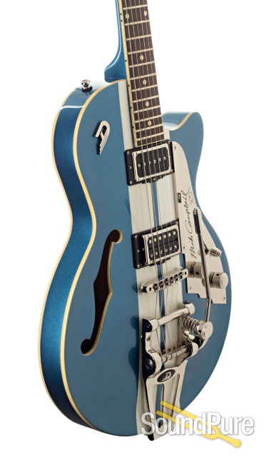 When I was a little kid, my older brother brought home a copy of Tom Petty's "Damn the Torpedoes" record and, after I got over a juvenile laugh about the swear word in the title, we sat down to give it a listen. It was my first memory of being exposed to an artist who would go on to have countless hit singles and a musical career spanning four decades and counting, his songs a welcome staple of classic FM radio and an ever-present soundtrack to my youth and beyond. As I got older and picked up the guitar, I began to notice something about those songs, an integral part of them that was so tasteful and even subtle at times, that I'd missed it for years. That integral part, of course, was Mr. Mike Campbell. He is a phenomenal player who is worthy of praise and respect as much for what he doesn't play as what he does. Sure, he can rip with the best of them ("Running Down a Dream", anyone?), but what has struck me the most over the years is his ability to come up with parts that serve the song perfectly, even if they don't call attention to his decidedly impressive playing. Needless to say, when I picked up this beautiful Duesenberg Signature model, I felt like I was sixteen again, picking out the chords to "American Girl" or trying to get the tremolo bar just right on the melody to "You Got Lucky". This guitar hits all the right notes, from the brilliant blue finish to the Domino P-90 and Grand Humbucker pickups. This baby is the perfect embodiment of one of the most amazing players of our time. Check it out for yourself!