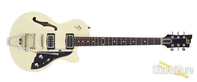 The distinctive arched spruce top and elegant flamed maple arched back has elevated the TV to one of the finest guitars in the world. Even being such a versatile instrument, it always retains its discreet character and enriches every type or style of music with its distinct Duesenberg sound. It will remind you of the time when Rock & Roll was still young.
