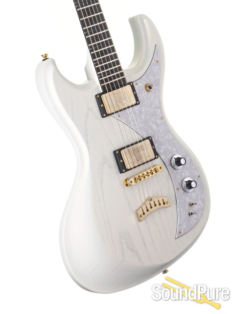 The Dunable Gnarwhal Cryptid is a bold, forward-thinking instrument that pairs striking visuals with powerful, articulate tone. Its swamp ash body delivers lively resonance and clarity, while the Korina neck and ebony fingerboard create a smooth, fast-playing feel with excellent definition. The Hellworm pickups offer a commanding voice, ranging from thick, driving output to more nuanced textures with the added flexibility of phase and series switching. Finished in a stunning white chalcedony pearl satin with aged gold hardware, it stands out with a refined yet aggressive presence. Dynamic, expressive, and full of character, this Gnarwhal is built to inspire every time you plug in!