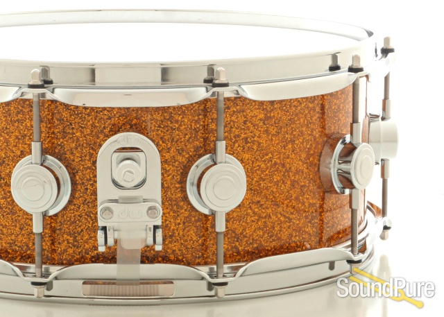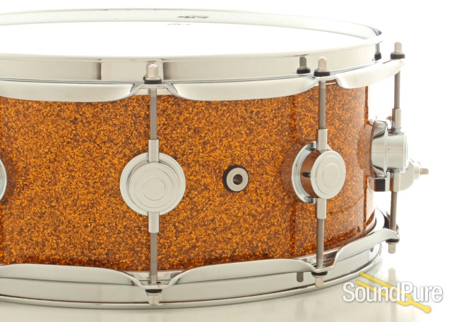 DW's flagship line, the Collector’s Series, are the original US-made custom drums. This drum features a maple/mahogany with a Burnt Orange Glass Glitter wrap.