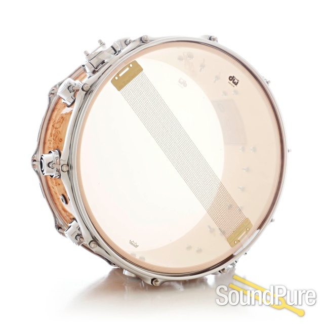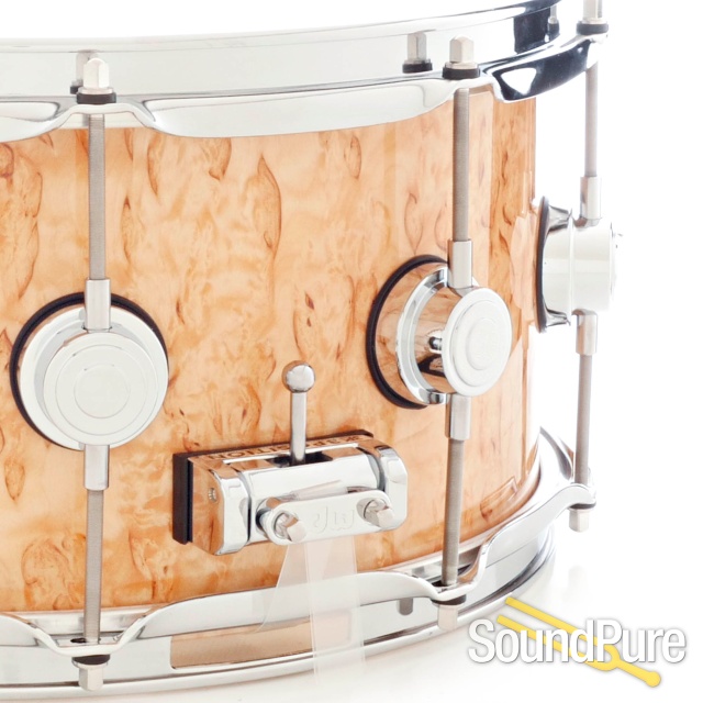 The Collectors series snare drums are equipped with premium features that include DW’s True Hoops which offer a nice balanced tone of triple-flanged hoops and die-cast hoops without the extra weight. The MAG magnetic throw off offers smooth and quiet action but also keeps snare wires in the on position without the risk of slippage. In the medium tuning range, this snare has plenty of body and bite. At the low end of the range this drum has the fat and sag of a 70's era drum sound but with a modern polish. In the high tuning range, the drum offers great crack and projection without sacrificing body. The Kurilian Birch has a visually striking appearance and perfectly complements the chrome hardware. It has the VLT shell and the shell note is a B