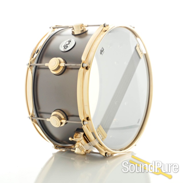This DW black satin over brass snare drum is one of the essential sounds any drummer should have. The 1mm rolled brass shell makes for a great live or studio snare. Tuned high, this drum offers great articulation, sensitivity, and cut. The lower tunings offer a fat and wet sound without loss of responsiveness. Suitable for a variety of musical applications, it offers that sought-after "classic studio brass snare sound" for rock, jazz and beyond; offering brightness and cut with a decidedly metallic tonal characteristic.