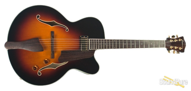 Eastman Guitars are fine handmade instruments at very reasonable prices. Their archtops and flat tops are made with solid, hand-carved tops, backs, and sides. They offer many of the traditional archtop styles in their Uptown series with options of different woods, dimensions, and pickups. The Thinline series, the El Rey and the Jon Pisano signature line offer some great alternatives, and feature the same kinds of customizable options. Eastman Uptown Deluxe series archtops are custom shop pieces with select AAA grade tone woods, wood binding with inlaid purfilng, and five piece necks.