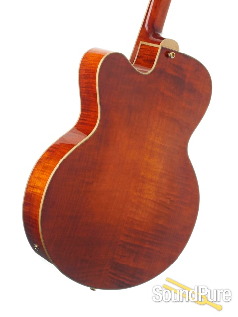 First and foremost, this archtop is a visual stunner. The honeyburst on this baby is warm and stately; it allows the beautiful grain on this carved spruce top to pop out and demand attention.