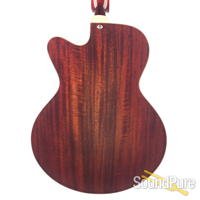 This brand-new model from Eastman is a wonderful hybrid of build styles, classic archtop tone and sensibility with a smaller body that limits the classic archtop issue of feedback. The mahogany back and sides produce a warm, stately tone with delightfully balanced mid-range. airy but pleasantly compressed highs and immediately responsive bass. Even when driven hard in a swing tune, this guitar maintains its tonal balance and gives you what you want from it, with nothing you don't. Plugged in, the Kent Armstrong humbucker provides a mellow, airy output that could almost, but not quite, be described as smoky. The dark burst that matches the mahogany back and sides make this guitar sure to turn a few heads, this is one of the more attractive Eastmans we've seen to date. And as always, you can't beat Eastman's quality-to-price ratio!