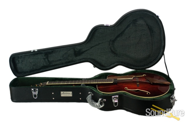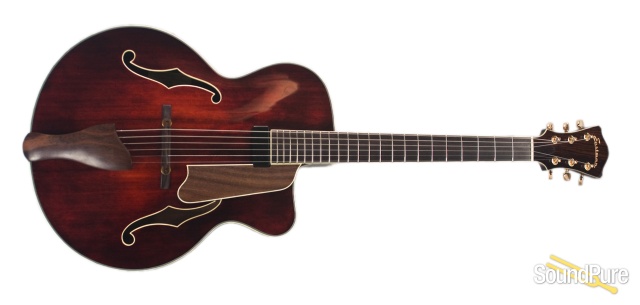 16" f-hole archtop with cutway and 1 floating humbucker Classic Finish. Mahogany back and sides.