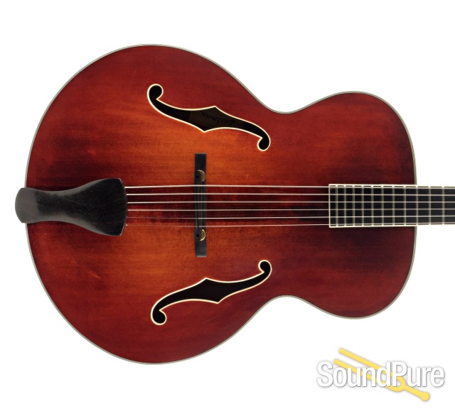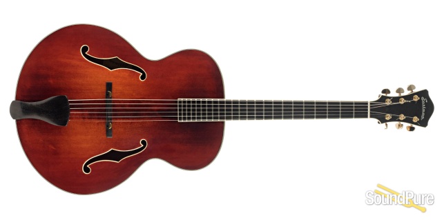 Carved Spruce top, solid carved mahogany back and sides with Rosewood bridge, tailpiece, pickguard and fretboard. Vintage tone with superior midrange and volume. Classic Non-cutaway.