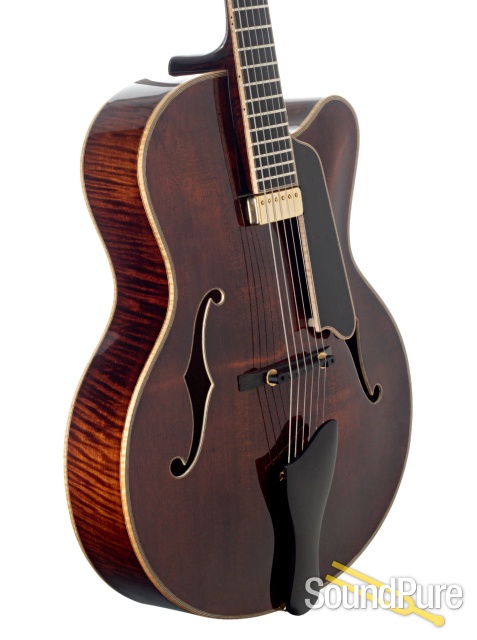 Amazing flame! You can get lost in there if you aren't careful. Play the guitar for a couple of minutes and you will lose yourself all over again in its warm, comforting wash of pure archtop tone. The neck is incredibly smooth on this one and it makes playing even the toughest passages feel a little easier. Even more comforting still is the knowledge that your tone is going to be full, airy, and complex, and with this guitar you can rest assured it will be. The full 17" body produces an incredibly well-rounded single note sound and lush overtones that make chords sing.