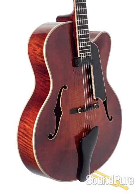 Amazing flame! You can get lost in there if you aren't careful. Play the guitar for a couple of minutes and you will lose yourself all over again in its warm, comforting wash of pure archtop tone. The neck is incredibly smooth on this one and it makes playing even the toughest passages feel a little easier. Even more comforting still is the knowledge that your tone is going to be full, airy, and complex, and with this guitar you can rest assured it will be. The full 17" body produces an incredibly well-rounded single note sound and lush overtones that make chords sing.