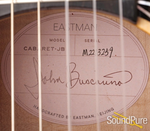 Eastman has taken John Buscarino's acclaimed Cabaret, unique for its ability to dive deep into the two massive worlds of nylon and archtop guitar playing, and, under his careful guidance, achieved an airtight production model that meets Buscarino's own exacting standards.  The look and feel of every instrument are as sophisticated as they are effortless; the voice manages to comprehend both the precision and power of an acoustic archtop with all the nuance and color of a high end nylon.  Players will feel just as comfortable shedding into the wee hours (the sound port really will change your perspective on solo play) as they will performing amplified thanks to the top notch L.R. Baggs LB6 that comes standard in every model.