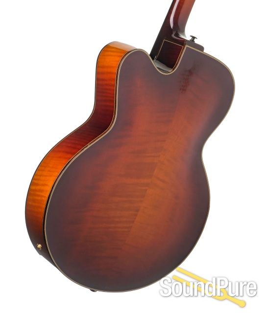 For the player seeking unparalleled tone and playability, this 2005 Eastman John Pisano Signature is a magnificent find! With its hollow body, hand-carved spruce top, and striking flamed maple back and sides, this archtop guitar delivers a rich, warm, and articulate sound that will inspire your playing. The meticulously crafted ebony fingerboard and comfortable C-shaped neck make it feel incredible in your hands. This isn't just an instrument; it's a solid investment in musical excellence, lovingly tended to and set up to provide supreme performance for years to come. The custom wooden knobs and unique tailpiece add to its visual allure, making this a true player's treasure.