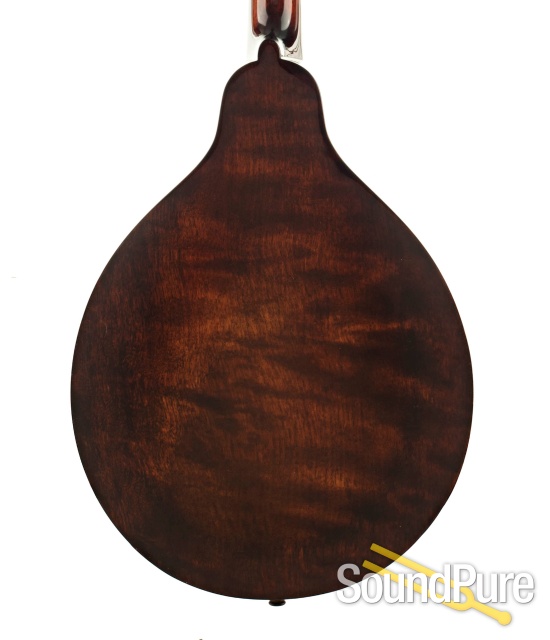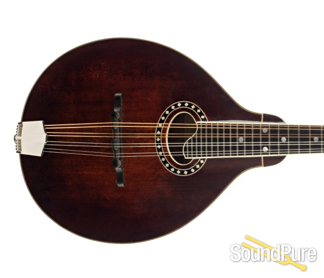 This is a sweet little traditional mandolin, with great slightly dark A-style tone. It's a great mandolin for someone who wants an appropriate instrument for folk or Irish music, it doesn't have that bright bite and aggressive tone that bluegrass mandolins have. It sports a classy dark stain finish that still highlights the topwood grain. The rosette around the soundhole is just plain cool!