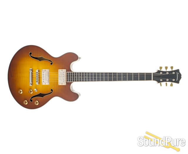 A compact 15” thinline with the soul of a full-body archtop. Carved Maple Top, Carved Mahogany back and sides with remarkable versatility for jazz, blues, and rock. Dual Seymour Duncan 59 Humbucker Pickups.