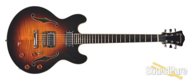 A compact 15” thinline with the soul of a full-body archtop. Carved Maple Top, Carved Mahogany back and sides with remarkable versatility for jazz, blues, and rock. Dual Seymour Duncan 59 Humbucker Pickups.