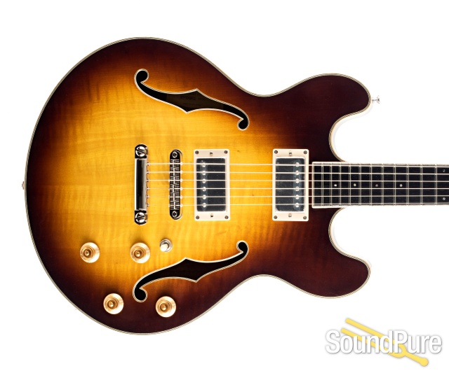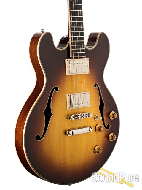 A compact 15” thinline with the soul of a full-body archtop. Carved Maple Top, Carved Mahogany back and sides with remarkable versatility for jazz, blues and rock. Dual Seymour Duncan 59 Humbucker Pickups.