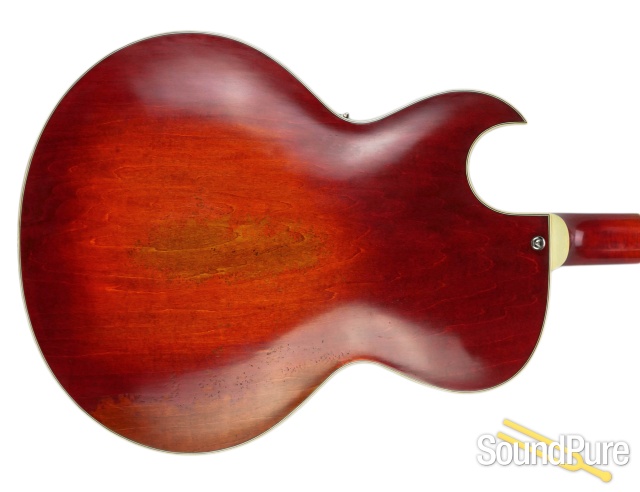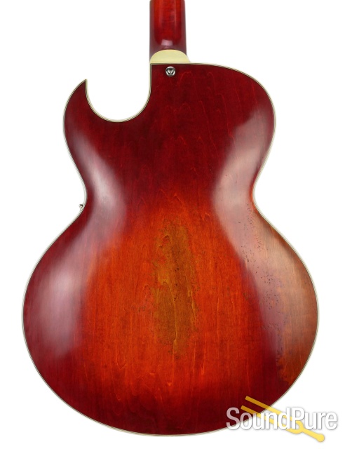Laminated maple top, back and sides. Rosewood bridge and fretboard, antiqued tailpiece with vintage tone, superior midrange, and volume. Classic Florentine cutaway, mounted humbucking pickup design.