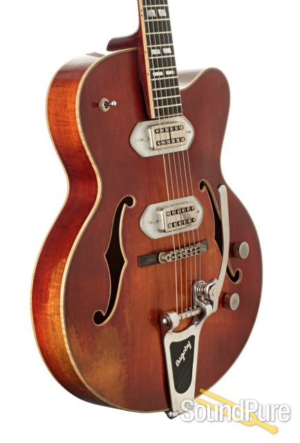 Eastman Guitars are fine handmade instruments at very reasonable prices. Their archtops and flat tops are made with solid, hand-carved tops, backs, and sides. They offer many of the traditional archtop styles in their Uptown series with options of different woods, dimensions, and pickups. The Thinline series, the El Rey and the Jon Pisano signature line offer some great alternatives, and feature the same kinds of customizable options. Eastman Uptown Deluxe series archtops are custom shop pieces with select AAA grade tone woods, wood binding with inlaid purfilng, and five piece necks.