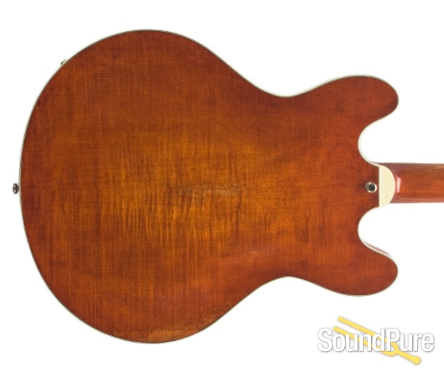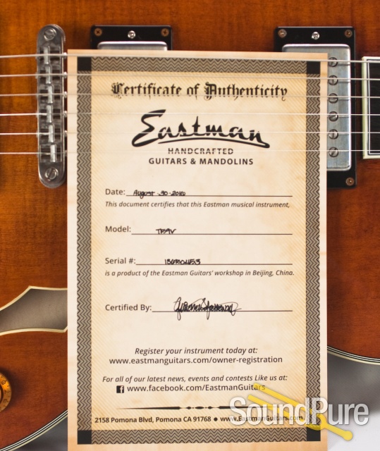 I think I'm in love!  Here's how it happened: first, the looks.  This has got to be the best Antique finish I've seen on a new guitar, varnish no less.  The tuners, the inlay, the binding--the aesthetics of the guitar don't scream so much as growl vintage.  Next?  Playability.  For me, the combination of a 1 3/4" nut and a short scale length are the definition of comfortable playing.  And then I plugged it in.  For those who haven't heard of them, the Seymour Duncan Seth Lover pickups are -the- humbuckers you need to know about it if you have even a passing interest in the classic guitar tones that embody Blues, Jazz, Rock n Roll and more.  Seth Lover invented the humbucker and these pickups are made exactly to his groundbreaking specifications.  Switching between neck, blend, and bridge positions is like a series of successive lessons in the history of American music--in hi-def!  Warm, full, and incredibly articulate, you can go from smokey-smooth jazz to downright nasty, gritty blues in a flash.  If you've been on the hunt for a vintage ES-335 or anything like it, well, Eastman has answered your question with this guitar and then some.  Call us up today to find out why this our favorite thinline from Eastman yet!