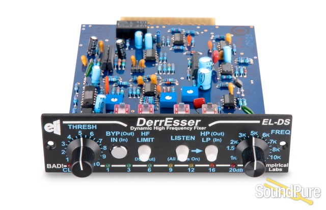 DS MODE - (Bypass Button IN, all other buttons OUT). As a de-esser in the DS mode (HF Limit OFF), the threshold can be set to tame harsh S’s (sibilants) that result from an overly bright singer or from EQ’ing to make a vocal sound aggressive and clear. The DS threshold is not level dependant, and compares the amount of high frequency content to the low frequency content, so adjusting the overall level does NOT affect the threshold. Easy to set and forget. Great care was taken to ensure this DS section meets the Empirical Labs reputation for originality and ease of use. We use the latest technology VCA, specially selected for glitch free, distortion free, and noise free performance. The time constants were carefully selected and the corner frequency is user adjustable with a high performance active crossover.