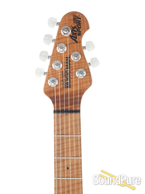 The Axis Super Sport guitar is offered with a roasted, figured maple neck, 22 stainless steel frets, and 2 exciting new finishes: Yucatan Blue and Roasted Amber. The Super Sport retains all the classic features, including the ever-comfortable asymmetric neck shape, proprietary Ernie Ball Music Man vintage tremolo with locking Schaller tuners, 5-way switch, volume/tone controls, and custom DiMarzio humbuckers. Available with your choice of flame or quilt maple top over a basswood body, this tonewood/pickup combination is a perfect recipe for hard edge rock tones but also delivers a subtle dynamic response at lower volume levels when needed.