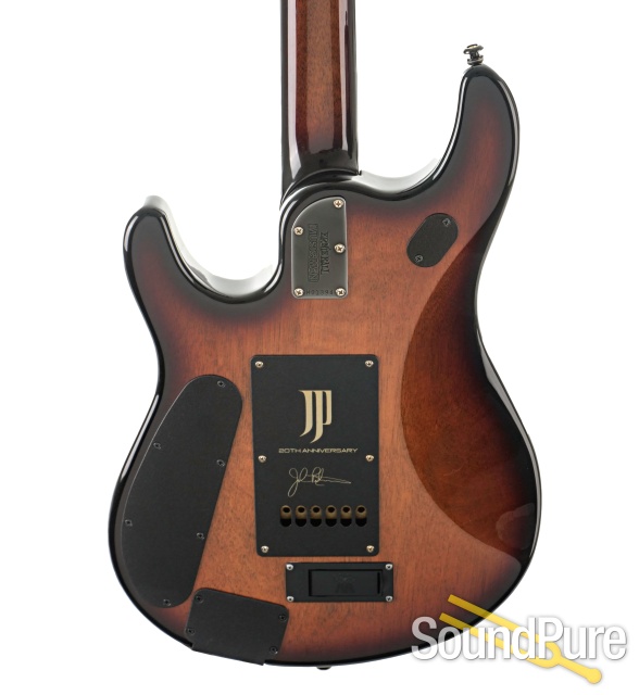 Ernie Ball Music Man and John Petrucci are proud to celebrate a partnership that has lasted for more than two decades, introducing the world to some of the most innovative guitar designs and technology. 2021 marks the 20th anniversary of the John Petrucci line of signature instruments. To honor this achievement, we are pleased to announce a custom limited edition 20th anniversary John Petrucci (JP) signature guitar. The 20th anniversary John Petrucci features a flamed maple top with a forearm scoop seated in a Honey Butter Burst finished Honduran mahogany body. This special signature is equipped with a load of unique options, including a grain-filled Mahogony bolt-on design, an Ebony fretboard with unique gold JP/shield inlays, a combination of gold and black hardware, and a laser-etched anniversary tremolo backplate. The electronics feature signature DiMarzio Crunch Lab (bridge) and Liquifire (neck) pickups combined with a +20db boost preamp and onboard piezo bridge system, giving the JP a focused and highly versatile palette of tones. This collectible anniversary guitar comes with an autographed certificate of authenticity and will have a limited ordering window, so make sure to order soon.