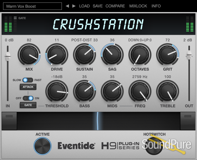 CrushStation also includes a three-band EQ, compression, and a noise gate that keeps things tight and focused. Use parallel processing to blend your pristine signal with crushing distortion for the perfect balance.