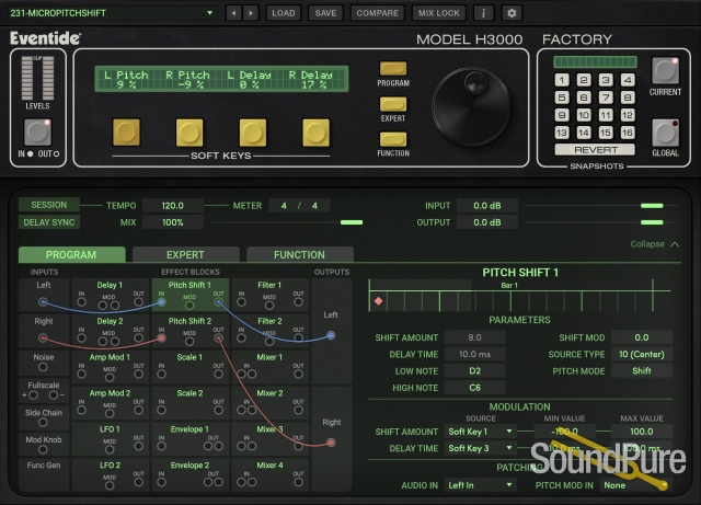 Features modern graphics that highlight the iconic design of the H3000 Harmonizer, now with a resizable user interface. Offers versatility with an expandable view and a streamlined patching workflow.