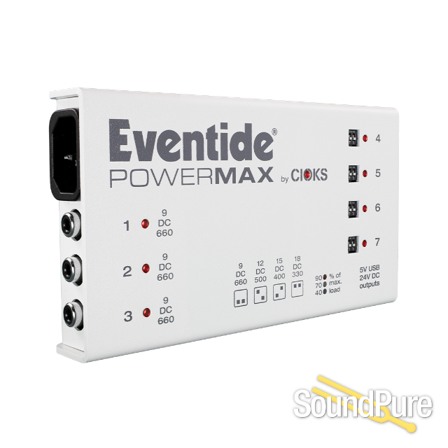 PowerMax ensures your pedals will achieve maximum fidelity and delivers an unprecedented 42W of power capable of powering up to 7 high current pedals, 3 outputs of 9V/660mA; 4 outputs switchable to 9, 12, 15 or 18V up to 660mA; A 24V DC AUX outlet for PowerMINI Expander, plus a USB output to power your smartphone or tablet. All outputs are isolated and ultra-low noise. PowerMAX is only 1lb and 1” high. PowerMAX is a state-of the-art Universal power supply (85-265V) which can be used worldwide.