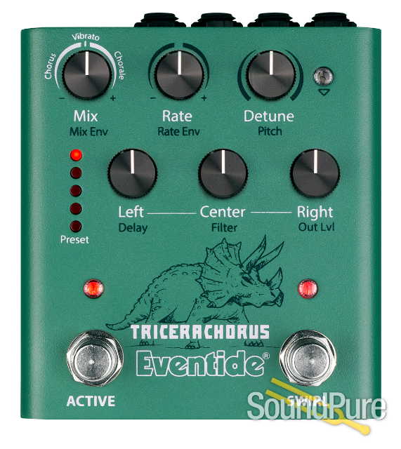 Inspired by the classic Tri-Stereo Chorus and stompbox choruses of the 1970s and early 1980s, the TriceraChorus pedal pairs rich Bucket Brigade-style chorusing with Eventide’s legendary MicroPitch detuning. TriceraChorus features three chorus voices and three unique chorus effects which can be used to create a wide stereo spread with pulsing waves of modulation. The innovative “Swirl” footswitch adds psychedelic flanging, phasing, and Univibe-style tones.