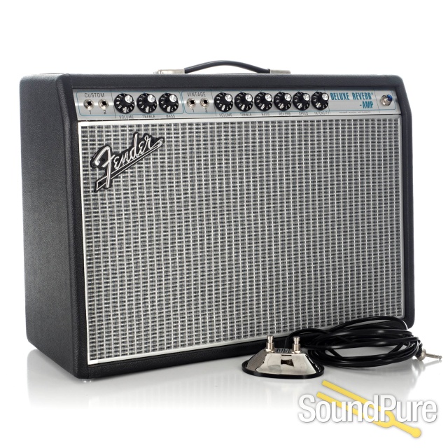 The guitarist with an eye and ear for late-'60s Fender silver panel style will love the '68 Custom Deluxe Reverb, which honors the classic look and great sound of that era's amps. Small, light and moderately powered, the Deluxe Reverb received a fresh new face in 1968—a silver-and-turquoise front panel with aluminum grille cloth trim, with tone, reverb and tremolo that was still pure Fender. The '68 Custom Deluxe Reverb also has modified all-tube circuitry, vintage channel for traditional silver panel tone, custom channel with Bassman® tone stack, and reduced negative feedback for greater touch sensitivity and quicker gain onset.
