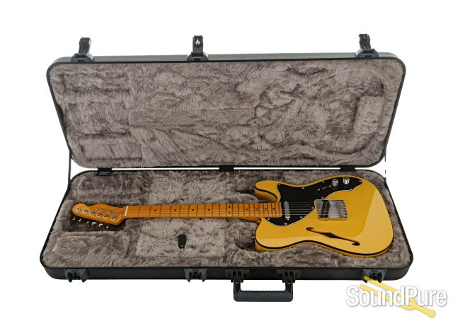 Britt Daniel's slashing precision-punk guitar style has helped fuel Spoon's 20 year career - from Austin clubs to stages around the world. Stunning in a custom Amarillo Gold lacquer finish, the Britt Daniel Tele Thinline guitar's lightweight semi-hollow ash body resonates sweetly while sacrificing none of the Telecaster's signature steely clarity - thanks to its Fender Custom Shop pickups and an S-1™ switch that allows you to change instantly between series and parallel pickup wiring. The one-piece "Deep C" maple neck shape fits comfortably in the hand and the 9.5"-radius fingerboard and medium-jumbo frets allow for fast playing and choke-free bending. Other features include Fender ClassicGear™ tuning machines, electrosocket output jack and Elite molded hardshell case.