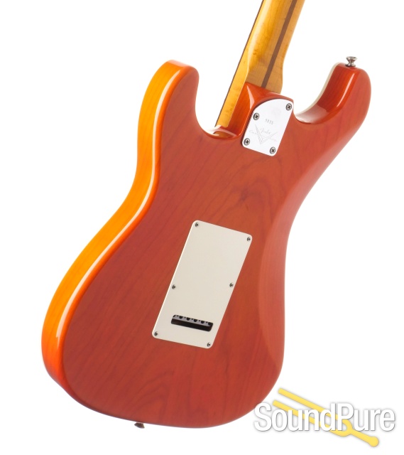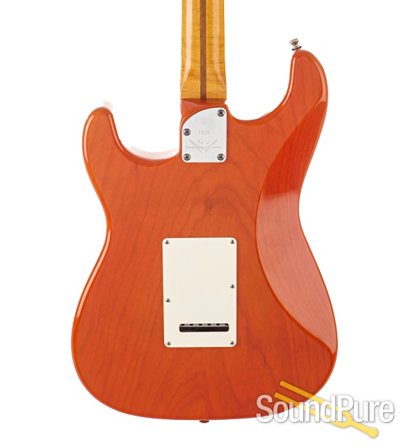 We nearly burned ourselves opening the case this thing is so hot! That flame maple top with the trans sunset orange finish looks stunning and is perfectly kept in check by that cream binding. And of course this Strat doesn't just look great. The medium C neck will make you feel right at home from the get go, and those Fender single coils are sure to make your heart skip a beat. We love the Fender custom shop and once you've played this you'll know why!