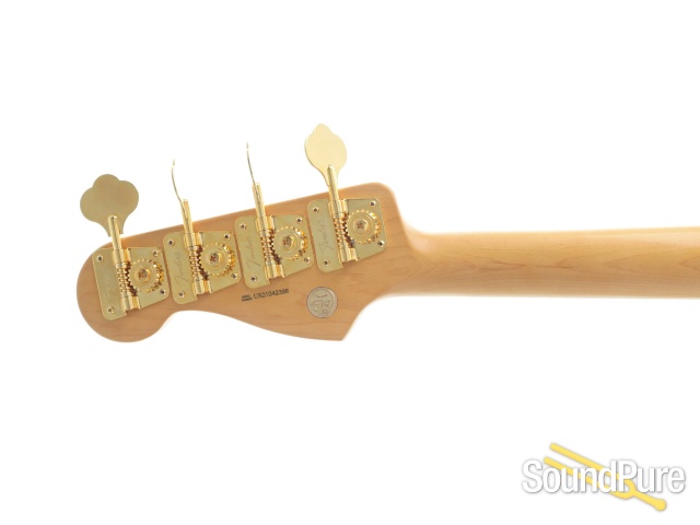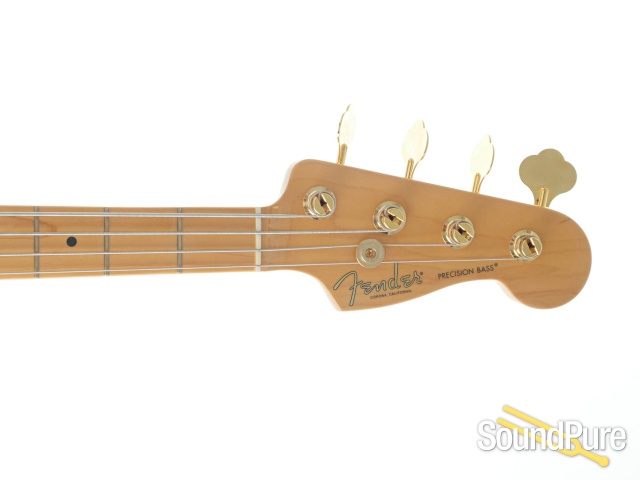 The 75th Anniversary Commemorative Precision Bass is decked out in a beautiful 2-Color Bourbon Burst finish over an ash body with gold hardware. The one-piece maple neck features a ’63 Precision Bass neck profile, rolled fingerboard edges, a “Super-Natural” satin finish and a sculpted neck heel for unsurpassed comfort and playability. Custom Shop ’62 P Bass pickups serve up vintage-style low-end and punch while the HiMass™ Vintage bridge enhances sustain, resonance and stability. Finally, every Commemorative Precision Bass features special badging with a 75th anniversary ingot inlaid into the back of the headstock and an engraved anniversary neck plate.