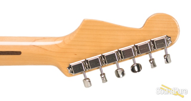 The American Vintage '56 Stratocaster® guitar takes you straight back to mid-1956, when the model was still new and when what is quite possibly the most prized and popular neck ever affixed to the instrument first appeared—a thick one-piece maple neck with a soft "V" shape and comfortably rounded edges. Such meticulous authenticity even extends to the single-ply white pickguard with eight holes, lightweight alder body (ash on White Blonde) with deep contours, and vintage-accurate pickups, bridge saddles, tuner spacing and more.