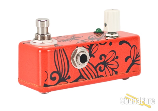 This controls the overall output volume of your Petal Pusher. Be aware, this device is capable of a very large volume boost to your signal. Make sure not to overload other effects or your amplifier! At full counter-clockwise position, your Petal Pusher acts as a unity gain line buffer to help negate impedance mismatches within your signal chain. Put the effect at the beginning or end of your signal path for this purpose. As you turn the control clockwise, you get a subtle transparent boost to your signal. This is great for eliminating signal loss due to long cable runs or having many true-bypass pedals. At full clockwise, the Petal Pusher can force other pedals or your amp into greater saturation and sustain. Or you can use it as a lead boost!