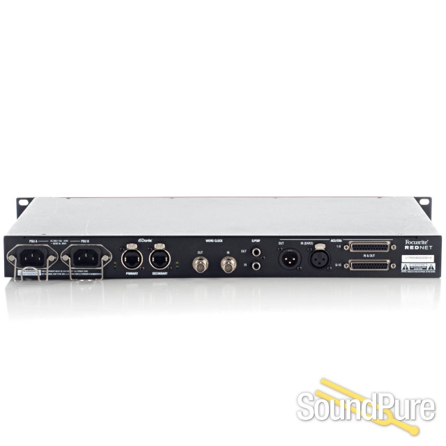 Two rear-panel DB25 connectors wired to the AES59 standard provide eight pairs of AES3 I/O, while an additional pair of XLR connectors allows flexibility in cabling choice for one pair of I/O. Additional RCA connectors allow the connection of consumer S/PDIF equipment. All external audio inputs include sample rate conversion, further reducing cabling and clocking complexity. Word Clock I/O on BNC connectors allows external devices to clock to RedNet D16R, or alternatively allows RedNet D16R to act as a network clock grand master slaved to external input. Power is supplied through a pair of locking IEC power inlets, and network connections are provided with a pair of locking Neutrik etherCON connectors; providing redundant operation or daisy-chained operation.