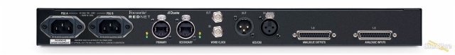 High-quality conversion with up to 119dB of dynamic range is provided through two rear-panel DB25 connectors while an additional pair of AES3 I/O is provided through male and female XLR for added flexibility. Word Clock I/O on BNC connectors allows external devices to clock to RedNet A8R, or alternatively allows RedNet A8R to act as a network clock grand master slaved to external input. Power is supplied through a pair of locking IEC power inlets, and network connections are provided with a pair of locking Neutrik etherCON connectors; providing redundant operation or daisy-chained operation.