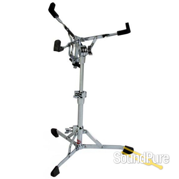 The Gibraltar 8706 Flat Base Snare Drum stand features a flat Leg base with memory lock, hinged height adjustment, and brake style gearless snare basket adjustment.